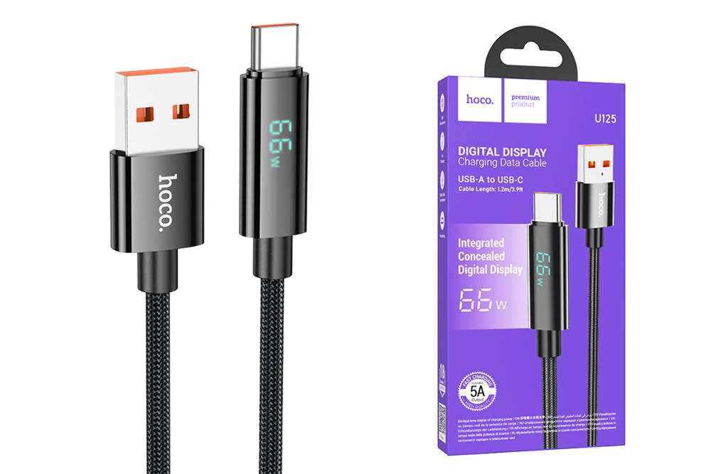 Кабель USB->Type-C Hoco U125 Benefit; 66Вт 5A; индикатор мощности зарядки; 1,0 м; черный